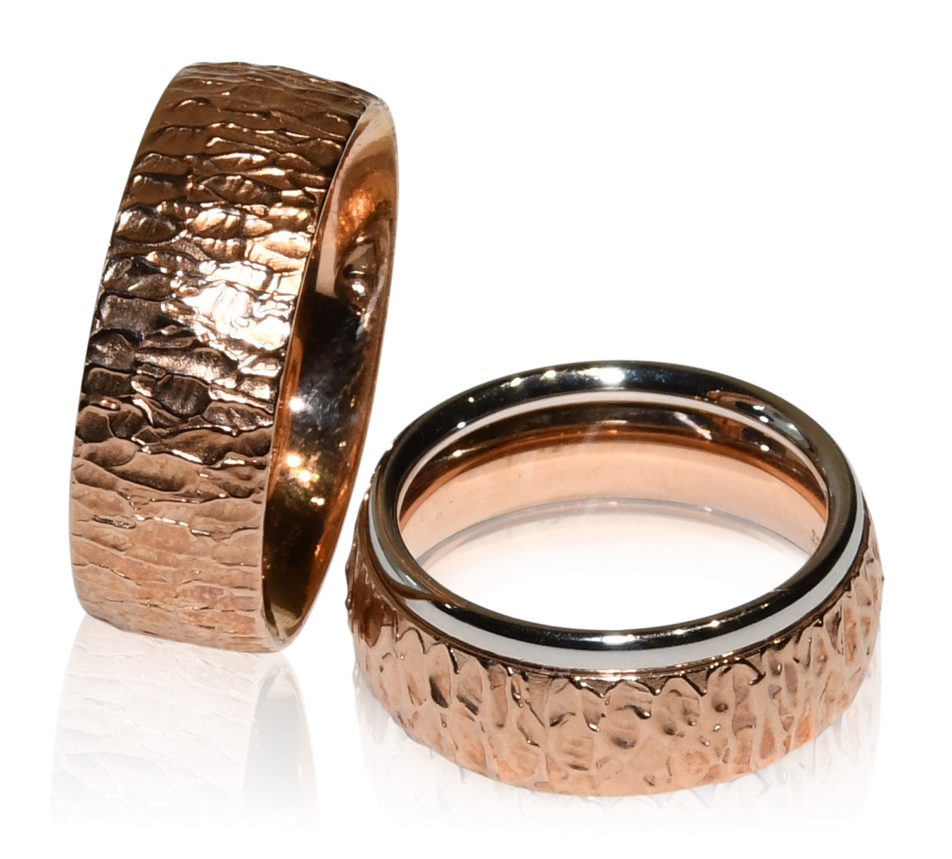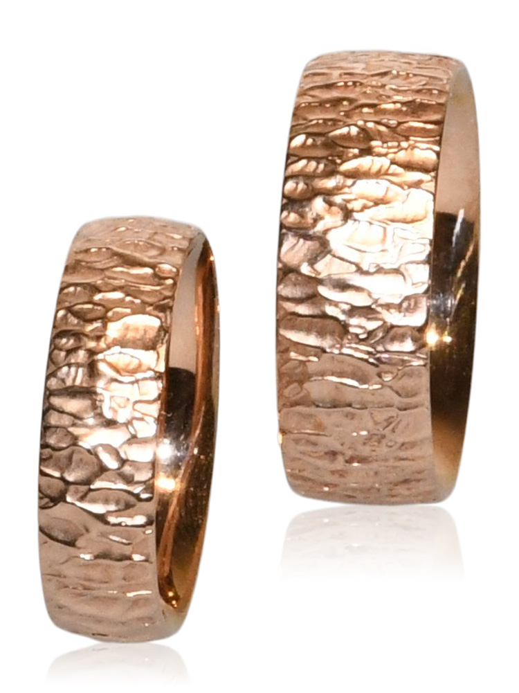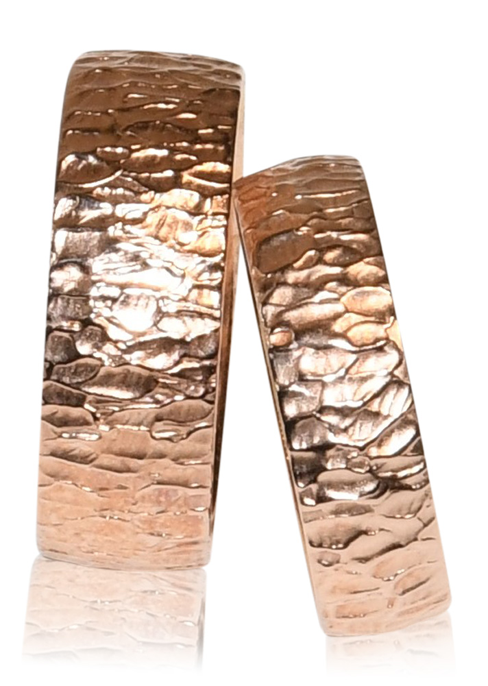 Dieses Ringpaar ist aus 925/Silber gefertigt und 750/Rotgold vergoldet. Der Damenring ist 6mm breit und der Herrenring ist 8mm breit. Diese Maße passend wir gerne auf Ihre Wünsche an. Die Oberflächen sind einzigartig, da sie von Hand in den Ring eingearbeitet werden.