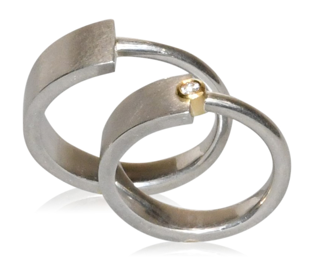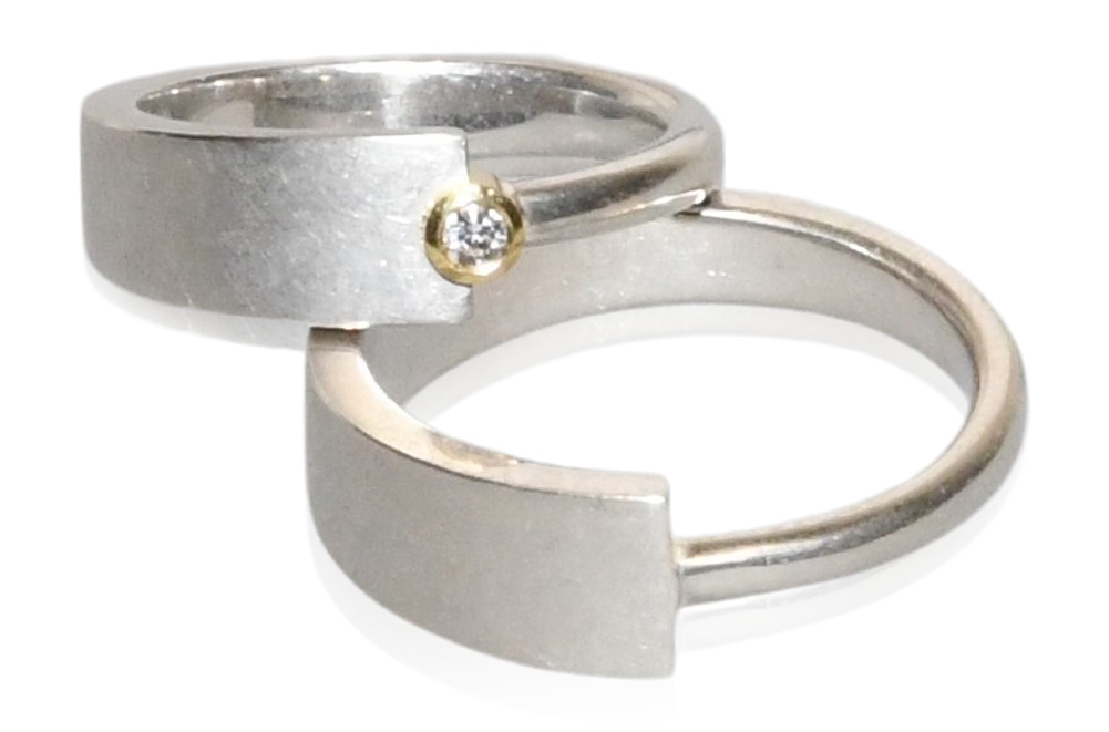 Dieses Ringpaar ist aus 925/Silber gefertigt. Im Damenring befindet sich zusätzlich ein Brillant 0,05ct in einer 900/Goldfassung. Der Verlauf der Ringe von "dick" zu "dünn" wird durch die verschiedenen Oberflächenbearbeitungen -matt und poliert- noch mehr betont.